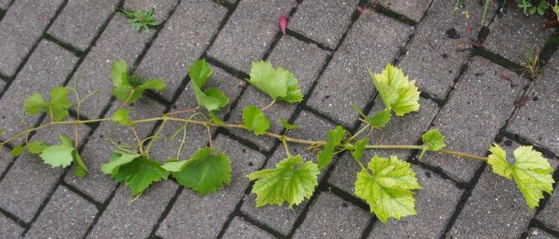 Hier mal ein chlorotischer Trieb des Weins den ich behandelt habe. Rechts die alten Blätter die kaum Verbesserung zeigen. Der Neuaustrieb ist anscheinend symptomlos. Es waren nur einige Einzeltriebe betroffen.