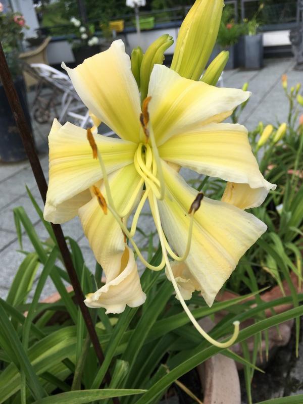 `Gentle Sheperd´ wächst hier auch. War für mich eine Aha-Taglilie. Einerseits was es außer Gelb und Orange an Farbe gibt, anderseits, dass nicht jede Taglilie eine ursprüngliche Wuchskraft hat. Zumindest hier muss man anfangs eine Weile auf sie aufpassen, dass sie nicht von der Umgebung aufgesogen wird. Das Unkrautgeum ist dummerweise mit auf dem Bild drauf, habe es mittlerweile akzeptiert, dass es mit dem Ausrotten nicht klappen wird.