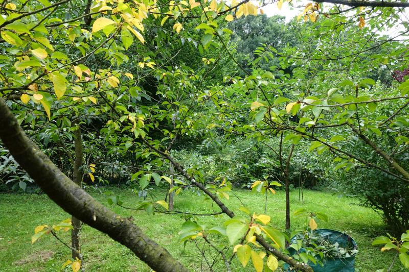 Er weist als einziger Kirschbaum viele gelbe Blätter auf (Mangelerscheinung), während bei den anderen Bäumen die gelbgefärbten Blätter so gut wie nicht auffallen.