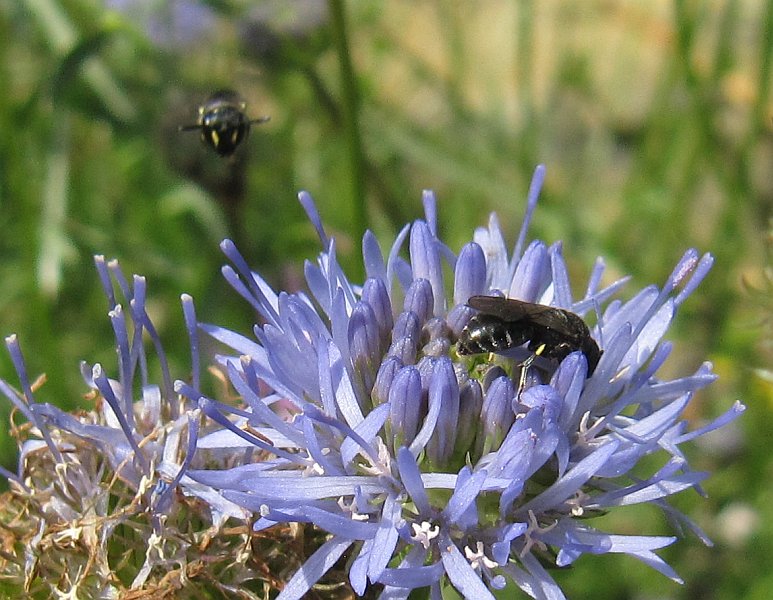 An Jasione montana ist derzeit viel los, hier eine kleine Maskenbiene, Hylaeus.