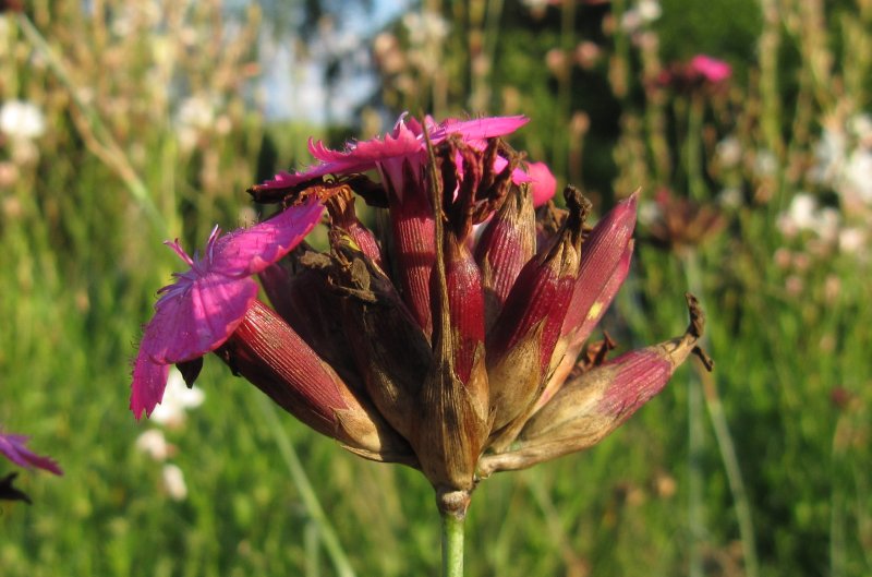 Kannst Du an der Nelke Nahaufnahmen der schuppenförmigen Hochblätter an den Kelchen machen? Das kann auch Dianthus giganteus sein oder eine andere nah verwandte. In Samenmischungen (leider auch für Landschaftssaaten) sind die oft als "Dianthus carthusianorum" untergejubelt.