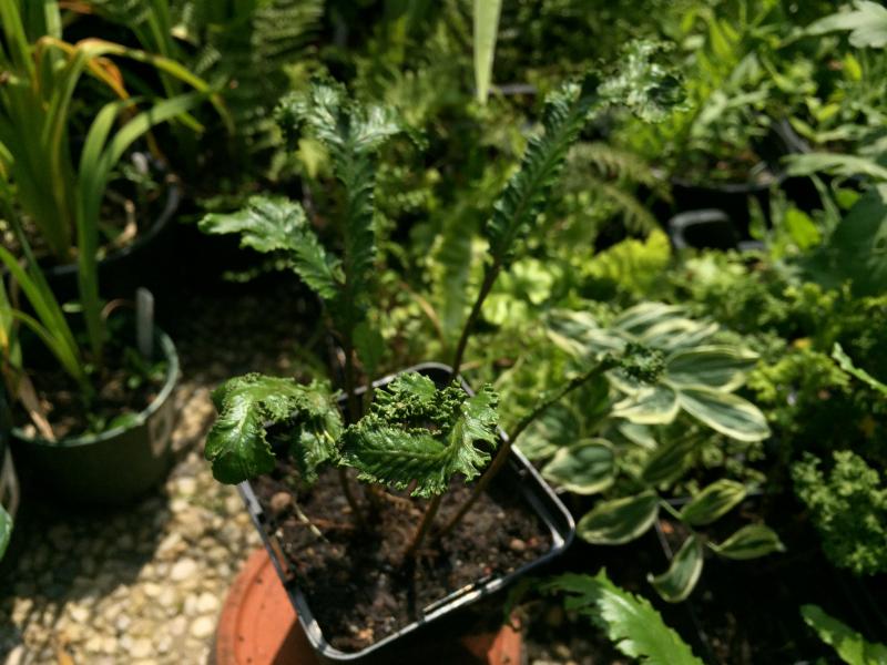 das war der topf, bei dem ich von mehreren sporlingen ausging, beim versuchten teilen zeigte sich aber, dass das alles an einem rhizomstock sprießt – bzw. spross, ein teil habe ich beim versuch, die vermeintlichen sporlinge zu trennen, davon abgerissen und nun extra getopft... mal sehen, ob das gut geht, das ganze teil war eh schon frisch getopft und einigermaßen wurzelfrei... :-\