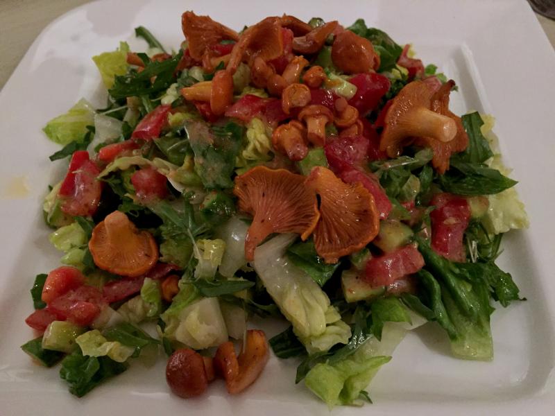 hier heute salat mit gartenrucola und gartengurke und waldgartenpfifferlingen