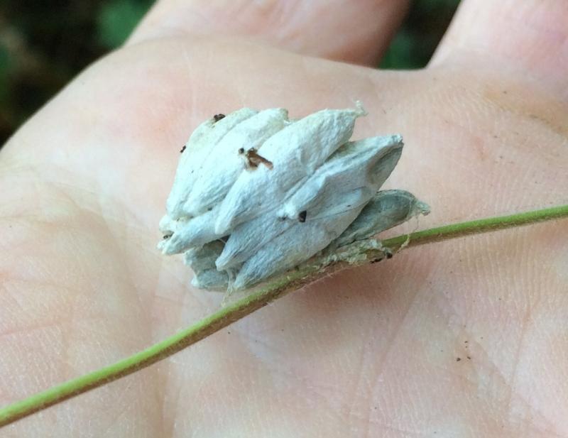 Dieses Gebilde hing gestern an einem Blattstiel von Geranium x cantabrigiense. Ich google mir seit zwei Stunden die Tastatur wund. Sind das Kokons? Wenn ja: wovon?