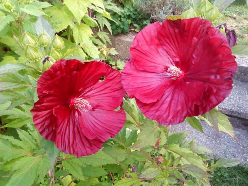 Der dunkelrote und der rosafarbene sind in diesem Jahr wiedergekommen; der weiße Hibiskus hat den Winter nicht überlebt.