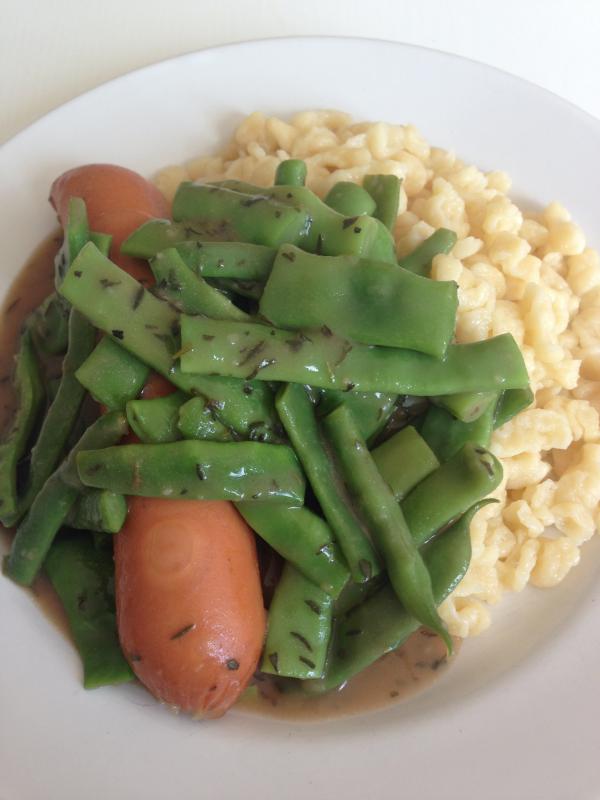 Hier gabs saure Gartenbohnen mit knöpfle und Knackwurst