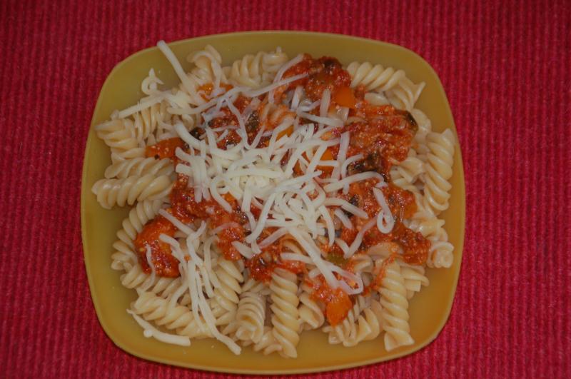Spirellen mit Soße aus Frühlingszwiebel, Paprika, Rest vom Ricotta-Tomaten-Zeugs.