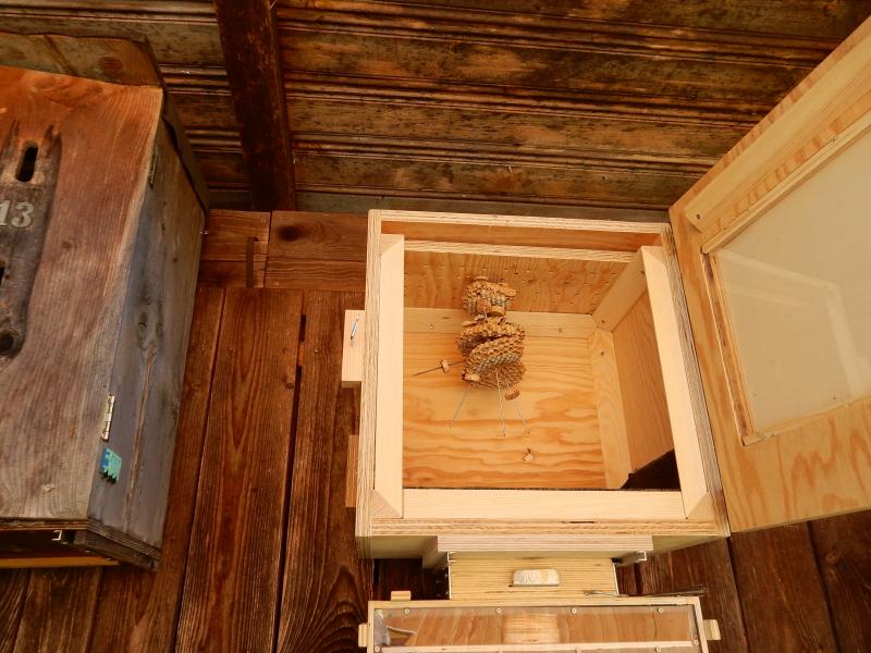 Das Nest wird in den Kasten eingesetzt, die Türe geschlossen, die Sperre geöffnet, damit die Hornissen vom Fangkasten nach oben klettern können.