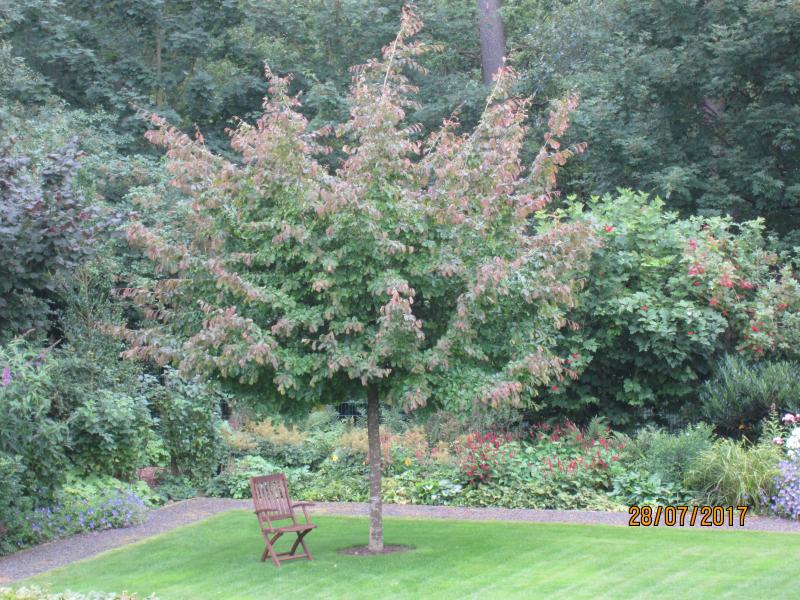 Die hiesige Parrotia persica steht auch in schwerem Lehm, und es geht ihr gold. Vor drei Jahren als 80/100-Jungpflanze gesetzt, hat sie inzwischen das Zwei-Meter-Maß überschritten.