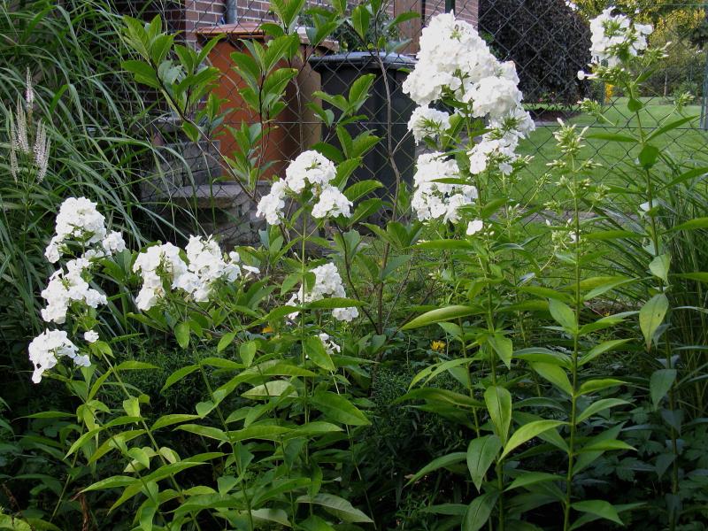 Zur Staudenbörse im Frühjahr brachte pumpot einen Phlox 'David' für Inken mit. Diese war aber leider nicht da, deshalb blüht das Teil jetzt bei mir sehr nett ;) Den Hintergrund kann nur Inken kennen, ich weiß nix, zeige aber mal das Foto. Phlox ist reinweiß, die Blätter eher breit. Absolut gesund und schön, auch nach dem Monsterregen.