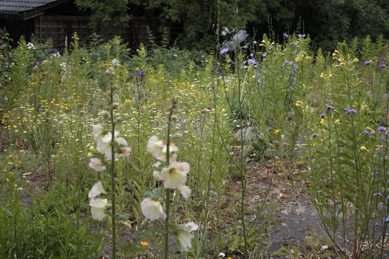 Eigentlich wächst dort nichts besonderes: Nachtkerzen, Ackermohn, Goldmohn, Kornblume, Löwenmaul, Löwenschwanz, Löwenzahn, Diptam, Wegwarte, verschiedene Kleesorten (gelb, weiss, rot), großer Wiesenknopf, munter mendelnde Färberkamillen, verschiedener Thymian, verschiedener oregano, Verbena hastata, verschiedene Königskerzen, Stockrosen und manches andere aus einem Samenpaket von den Dorfbewohnern.