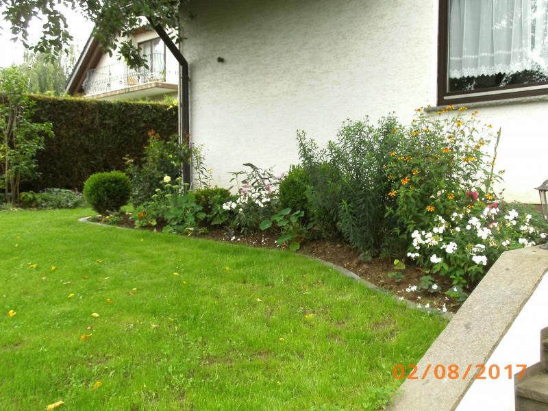 So sieht es zur Zeit vor dem Haus aus. Ich bin soweit ganz zufrieden. Von den Sämereien ist allerdings nicht allzuviel aufgegangen: Eine Stockrose und eine Sonnenblume habe ich entdeckt.