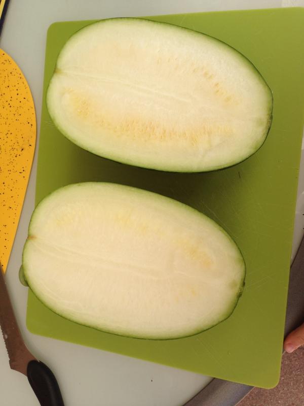 Die andere ist eine Cream of Saskatchewan, die ist an der Auflagefläche noch nicht gelb. Das mit dem Hohlklingen kann ich irgendwie nicht. Für mich klang sie schon hohl als sie 10cm Durchmesser hatte. Mittlerweile ist sie aber bei ca. 30cm, also war sie da definitiv noch nicht reif.