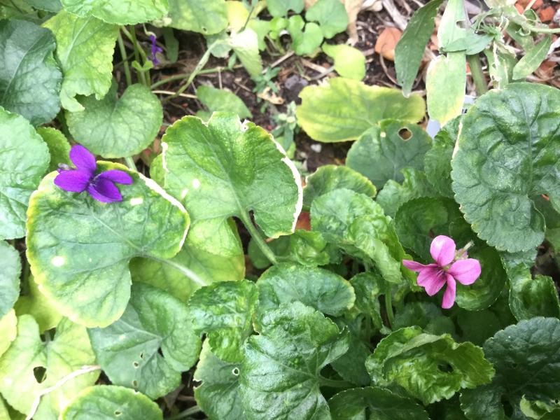 Viola odorata -Sorten blühen hier auch schon seit Herbst, war nie wirklich ausdauernd frostig, aber wohl doch zeitweise kalt genug, dass diese normalerweise weißlich-grauen Charlottenfindlinge in fast Veilchenviolett erscheinen.