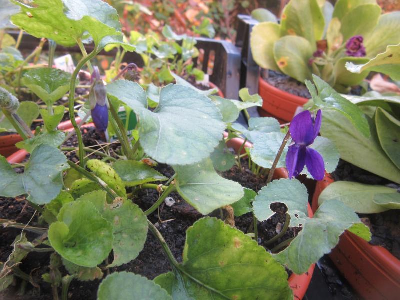 In den letzten Tagen blühten hier, wenn auch spärlich, einzelne Viola odorata, farbig und nicht nur kleistogam. Das auf dem Bild ist eine verwilderte `Königin Charlotte´ , die "Herbst"blüte ist eine ihrer (möglichen) Eigenschaften. Gesehen habe ich es außerdem an `Couer de Alsac´ `Coeur d'Alsace´ (kann das auch gelegentlich) und einem anderen rosa Veilchen ohne Namen. Beide allerdings in Tontöpfen.