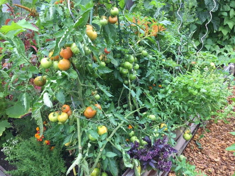 Heute habe ich eine der Freilandtomaten entsorgt, die schutzlos der Witterung ausgesetzt sind. Es regnet dieses Jahr etwas viel. Immerhin halten sich die anderen Pflanzen noch.