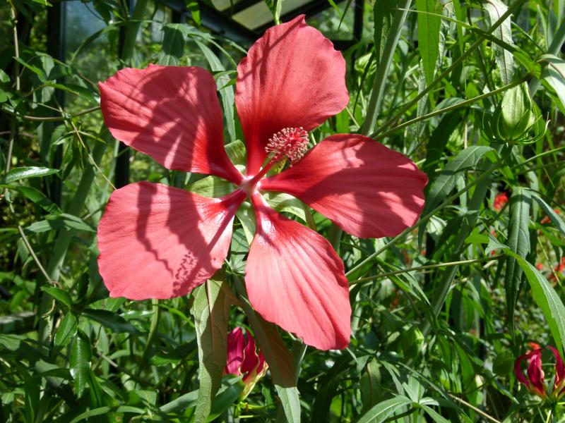 Hier kommt Hibiscus coccineus, Bild von gestern. Ich finde die Art äußert elegant. Ich habe sie ausgepflanzt im ungeheizten Gewächshaus, wo sie aber schon den First erreicht hat. Vielleicht grabe ich sie im Herbst aus, um sie zu bändigen. Im Winter dick mit Vlies abgedeckt.