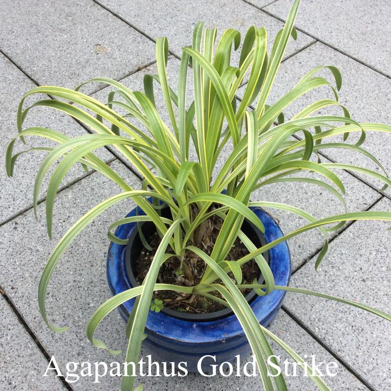 Agapanthus Gold Strike, blau blühend und immergrün.