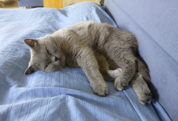 Heute sitze ich nichtsahnend am Computer, da nimmt die doch Anlauf, segelt elegant los und landet sanft und sicher auf dem kleinen Tisch, ohne auch nur irgendwas zu berühren oder runterzuwerfen. Und dann weiter mit einem zufriedenen Seufzer aufs Bett. Ich glaube, die hat die halbe Nacht gerechnet, wo gestern der Fehler lag.