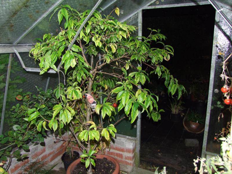 Mein Ufo-Pfirsich Saturn steht seit drei Jahren im Gewächshaus im großen Maurerkübel und trägt jedes Jahr 40-50 Früchte.