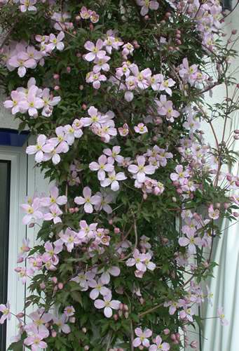 scilla, ich lasse eine an einer Pergola hochwachsen und eine andere an einem Zaun entlangwachsen. Die Montana Rubens am Zaun habe ich vor 3 Jahren gepflanzt, die nimmt ungefähr 5 m des Zaunes ein. Die andere nimmt die ganze Pergola mittlerweile in Anspruch und macht anstalten, die daneben stehen zu erobern.Seit gestern hat sich blütenmäßig unheimlich was getan