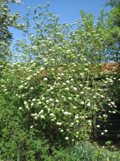 Dann habe ich mit dem Garten damals auch noch einen Viburnum übernommen, der jetzt anfängt zu blühen. Da weiß ich auch nicht den Namen. Ein mächtiger Strauch ist das geworden, derzeit ca. 4 m hoch, und fängt jetzt auch an, in die Breite zu gehen.Leider wird das Bild bei dem kleinen Format nicht scharf.