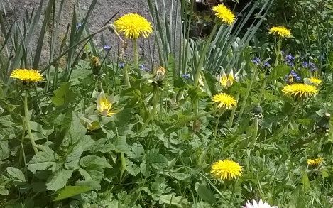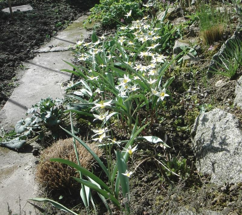 Bei mir in der Wiese sind, wie auch immer, Zwiebelchen von T. tarda gelandet. Auf dem (schlechten) Bildausschnitt kann man aber erkennen, daß sie ihre Blütenköpfe über dem Giersch öffnet, sobald sie Licht sieht ;)