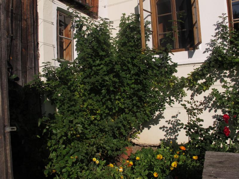 Und von der Nordlandrose, die im Juli schon fast verblüht war. Habe heuer endlich den Mut gehabt, sie nach der Blüte kräftig zu schneiden, stufig von unten her, um beim Anbinden nicht immer bis ans Dach klettern zu müssen - mal sehen, ob sie das versteht :-\