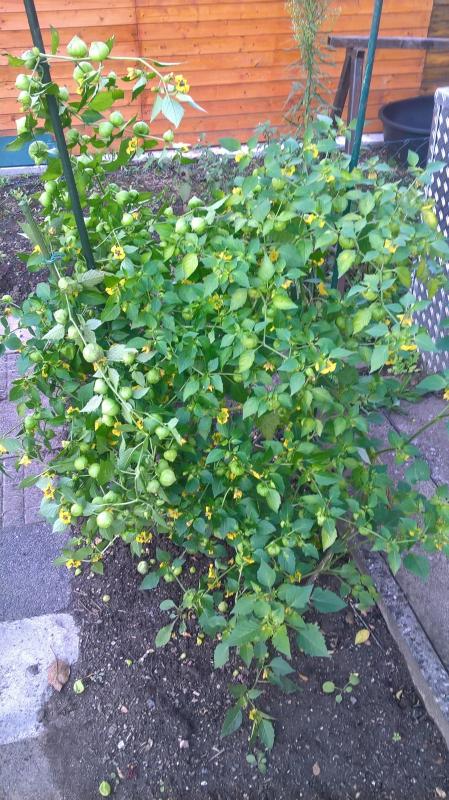 Bei mir ist eine Nachtschattenpflanze wild gewachsen. Hatte Glück im Schatten von den Erbsen groß zu werden, ansonsten hätte ich die für gewöhnlichen Nachtschatten gehalten und gejätet. Einerseits sieht es etwas anders aus als die Andenbeere, die ich im Baumarkt gekauft habe. Die Pflanze hat viel dünnere, nicht behaarte Blätter und Stängel. Im Physallis Thread wurde geschrieben, dass es sich vielleicht um Lampion-Pflanze handelt. Aber alle Lampions die ich bisher gesehen habe sehen ebenfalls ganz anders aus. Viel kleiner, nicht buschig, mit ganz anderen Blättern und die Lampions sind schon alle rot.