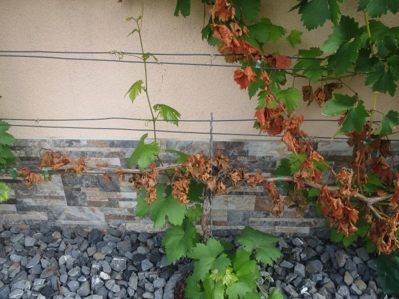 Es war nur selten heiss, aber die Schäden kamen bei mir innerhalb von zwei Tagen. Das war der 29. und 30.8. und ein paar Tage vorher mit voller Sonne, hoher Luftfeuchtigkeit (über 70% rel), 31°C. Feuchtigkeit im Boden hatte es genug. Dieses Jahr immer. Es war Hitze bei hoher Luftfeuchtigkeit. Die Sonne stand auch schon etwas tiefer, so dass sie im Gegensatz zu Juli auch Trauben dauerbestrahlte, die Blätter oben drüber hatten.