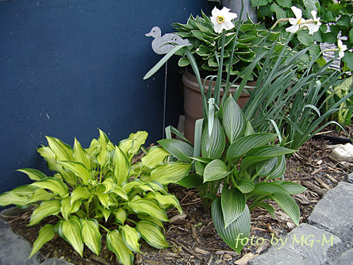 Ich mache z.Z. mehrmals am Tag den Rundgang ums Haus um ja keinen Entwicklungsschritt bei meinen Hostas zu verpassen. Frühlingsgold präsentiert sich jetzt am schönsten, Devon Green daneben braucht noch ein bischen... Dahinter steht noch Allan P. McConnell.Ich hoffe nur inständig, daß mir nicht wieder durch Hagel die schönen Blätter zerstört werden
