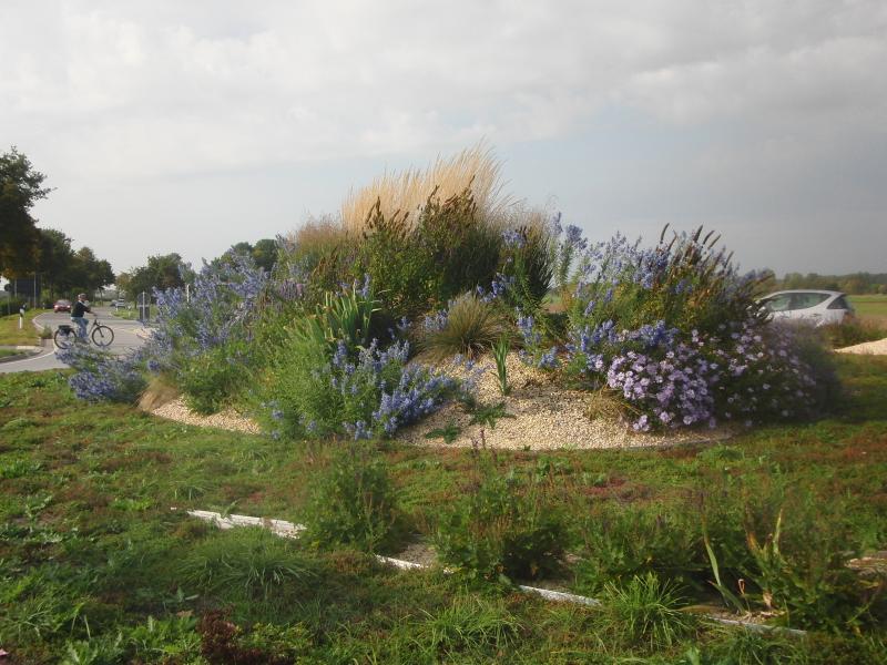 In unserem Städtchen sind vor ein paar Jahren einige neue Kreisel entstanden, alle von Cassian Schmidt umwerfend gestaltet und bepflanzt, das Bepflanzungsmotto heißt erneuerbare Energien. So gibt es den gelben Sonnenkreisel, den rot-orangenen Feuerkreisel mit u.a. inzwischen beachtlichen Opuntien, zwei Wasserkreisel im Stil von Silbersommer, nachwachsende Rohstoffe mit Wucherzeugs, und dieser hier vorgestellte der Windkreisel.