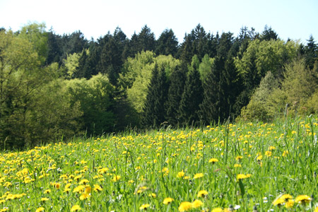 So sieht es derzeit hinter unserem Garten aus.Die sonnige Hälfte der Wiese ist mit Löwenzahn übersäht....