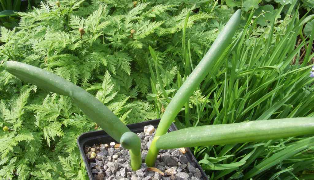 Auch ziemlich paradox: Allium altaicum, die Urform der Winterzwiebel, mit seltsam aufgeblasenen, hornartig abstehenden Blättern. In unseren Breiten soll er verlässlich hart sein, die von mirerworbene Form soll auch annehmbar große Blüten haben. Ich bin gespannt!