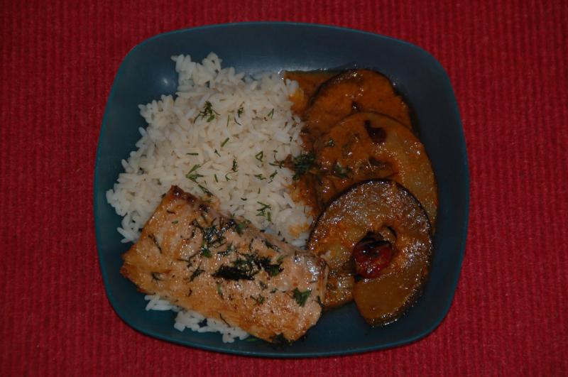 Wildlachs in Dill, dazu Reis und (statt der geplanten Rote Bete, die ich erst kochte und dann anbrennen ließ ::) :-[) eingelegte zucchini