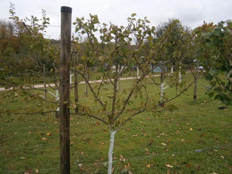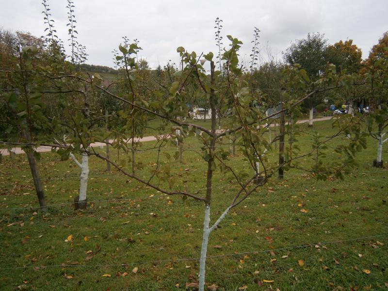 richtig, die unteren Äste auf den Bildern, haben einen 90° Winkel. Für Steinobst sollte man eher bei 45° bleiben. Das ist beim Apfel kein Problem aber bei Steinobst wird der Ast zu schnell alt. Ich meine, dass bei einem zu hohem Winkel, auch der Gummifluss gefördert wird. Dazu muss man, wie schon geschrieben, auch die Winkelerhöhung durch den Behang immer mit bedacht werden, obwohl es beim Spalier ein kleineres Problem ist. Bei einer Spindel, mit den schwächeren Ästen, fällt das stärker zur Waage.