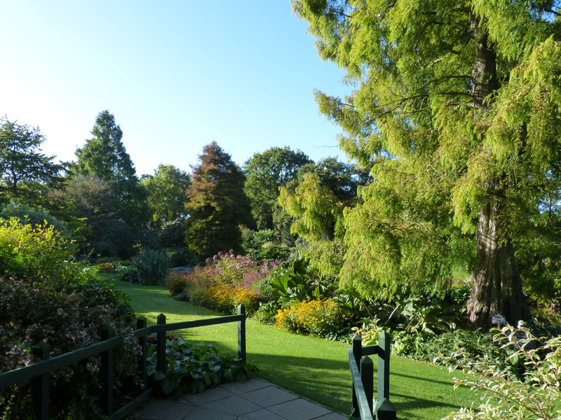 Geht man weiter in den Garten, wandelt sich das Bild völlig. Alte Mammutbäume und Sumpfzypressen, großzügige Wasserflächen, imposante Gunnere, immer wieder Phormium und Thalia dealbata.