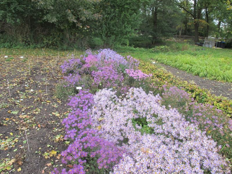 Hier mal ein Blick auf meine Vergleichspflanzung von Aster amellus u.ä. Vorn links leuchtet 'Veilchenkönigin', in der Mitte blüht seit Wochen 'Lutetia', hinten rechts sieht man 'Wunder von Stäfa'. Wir haben zwei rosa Sorten, 'Rosa Erfüllung' und 'Brillant'. Letztere ist die dunklere. Sie gefällt mir besser, wird allerdings kaum verlangt, weil sie ziemlich unbekannt ist.