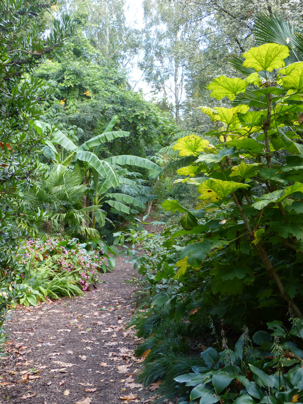 Hinter der nächsten Ecke wird es tropisch mit Baumfarnen, Musa, Tetrapanax und vielem anderen.