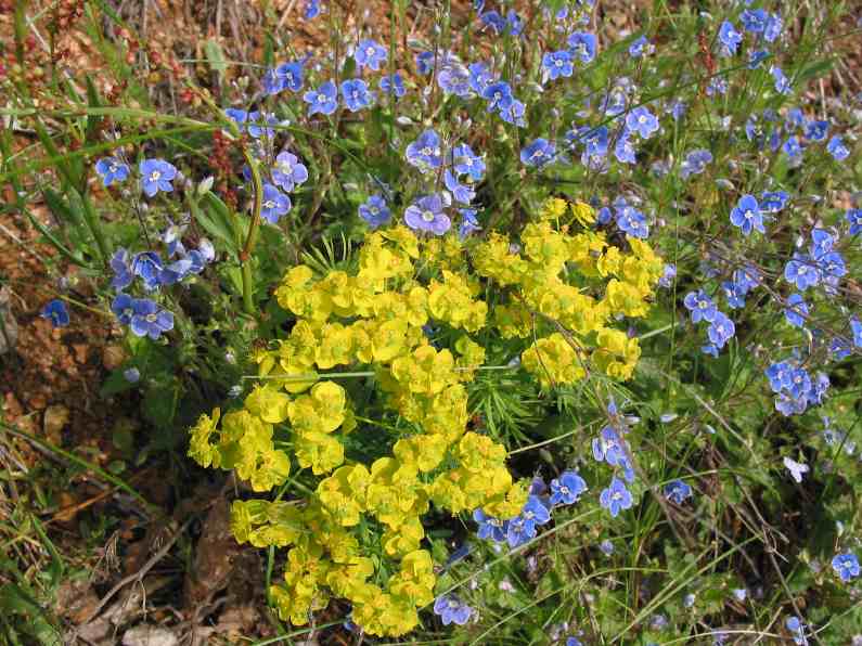 Zypressen-Wolfsmilch Euphorbia cyparissias eingerahmt von Gamander-Ehrenpreis (Veronica chamaedrys).