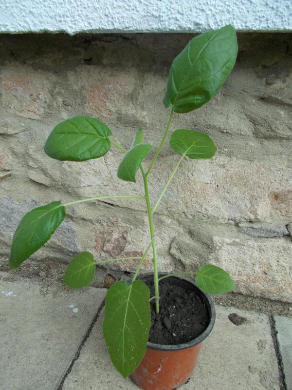 Im mit Digitalis ferruginea beschrifteten Aussaatgefäß sind vier Pflanzen gewachsen, eine große (im Bild, nach Umtopfung) und drei kleine mit grundsätzlich ähnlichem Habitus. Nun sieht das Ganze irgendwie so gar nicht dem ähnlich, was ich sonst an Digitalis habe, und von der auf den ferruginea-Bildern im Netz befindlichen Grundrosette gibt es keine Spur.