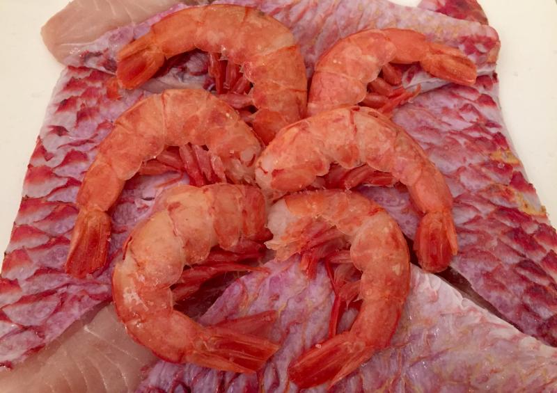 hier ein schnelles mittagessen: rotbarbe und garnelen auf blattspinat