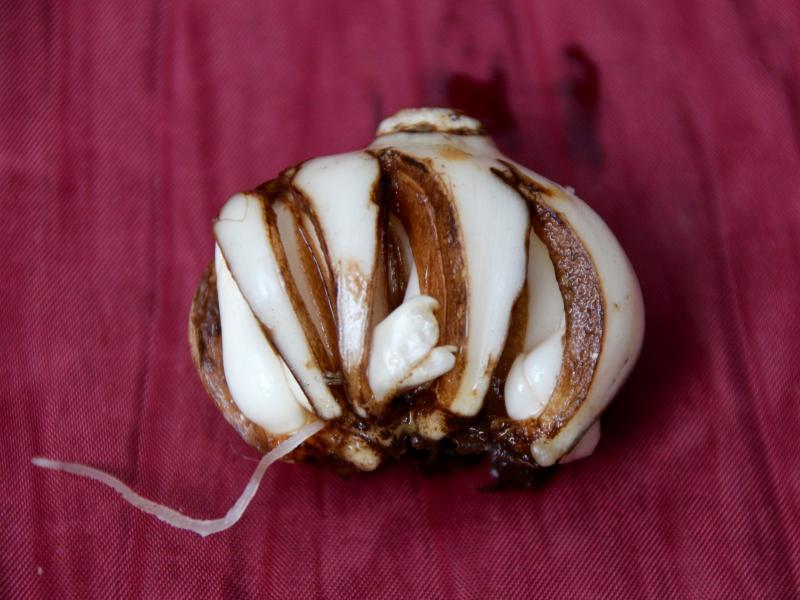 Zuwachs im Folgejahr. Deshalb habe ich eine Zwiebel bis in die Basis angeschnitten, in sterilem Substrat in einem Torftöpfchen untergebracht und dieses im Gitterkörbchen direkt im Garten versenkt. Da bin ich echt