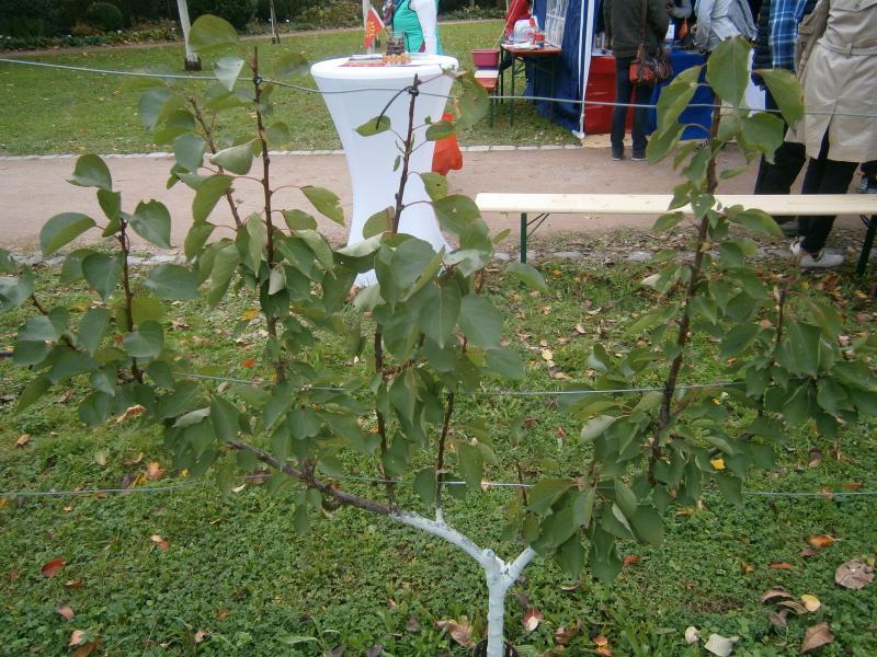 Ein häufig gemachter Fehler ist der, dass das Spalier zu schnell aufgebaut wird. Dies führt dann zu Aufbaufehlern. Man sieht dies ganz schön auf dem letzen geposteten Foto aus dem Botanischen Obstgarten Heilbronn. Bei der dort gezeigten Palmettenform sind alle senkrechten Leitäste gleichzeitig gezogen worden. Der Aufbau ist natürlich noch nicht abgeschlossen. Dies ist aber ein Fehler. Man sieht es jetzt schon, die in der Mitte stehenden Triebe werden dominant, während die Außentriebe verkümmern. Die Mitte wird durch den Baum aber mehr gefördert als die außen stehenden Triebe. Der zu erkennenden Trend wird sich im nächsten Jahr verstärken, wenn nicht korrigiert wird. Die gezeigte Erziehung missachtet ein Wuchsgesetz und wird nicht zum Erfolg führen. Der Fehler ist bei dem jungen Baum noch leicht zu korrigieren, indem im Frühjahr die Außentriebe belassen und die mittleren Triebe stark zurückgenommen werden. Entfernen würde ich sie nicht komplett, da beim Steinobst die Verkahlungsgefahr besteht. Man bekommt dort also vielleicht keinen geeigneten Trieb mehr. Deshalb würde ich nur auf Augen einkürzen. Wäre diese Maßnahme schon im Sommer erfolgt, wären die äußeren Triebe deutlich besser entwickelt und man wäre sicher 1 Jahr früher mit dem Aufbau des Spaliers fertig. Der Baum würde dann aber zum jetzigen Zeitpunkt noch unfertig wirken, was er ja auch wäre und sein sollte.