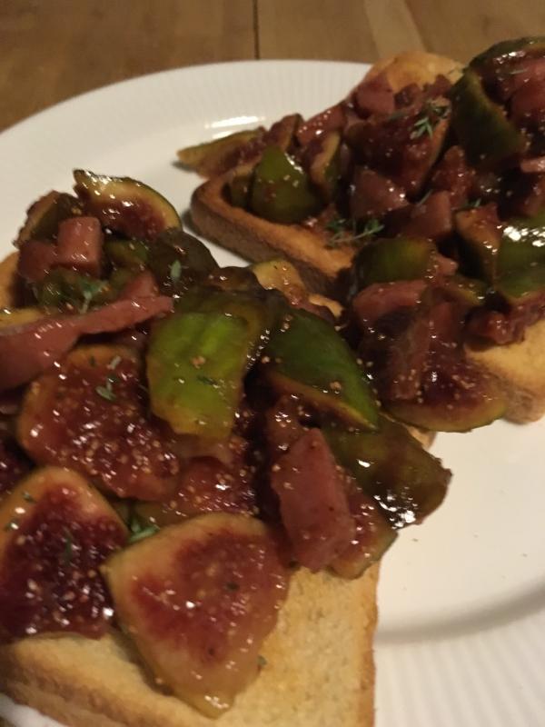 Frisch geerntete Feigen, angebraten mit Speck, auf Toast