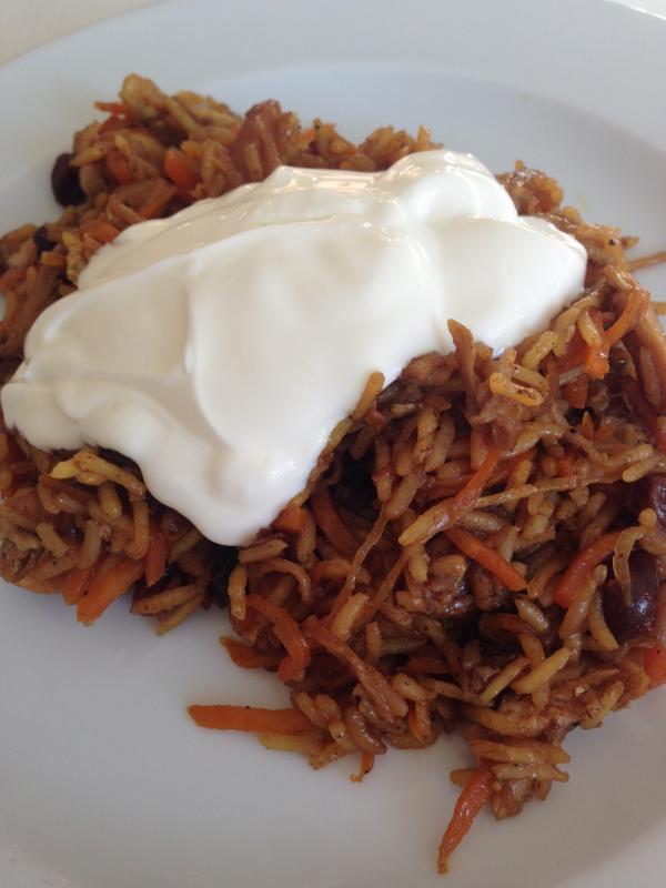 Orientalischer Reis mit Hähnchen, Karotte, Zwiebeln, Knoblauch, cashewkerne, Datteln, Rosinen und ordentlich Gewürzen. Joghurt oben drüber. Lecker!