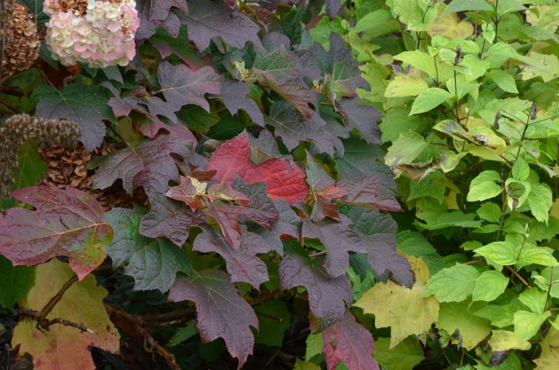 Die Herbstfärbung ist klasse, aber die riesigen Blüten ziehen die Triebe extrem nach unten.
