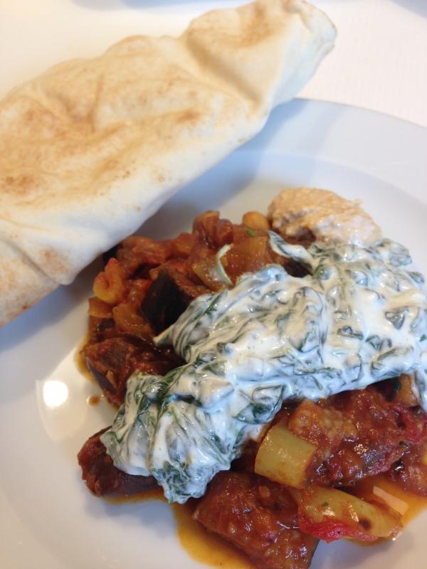 Zwiebeln, Knoblauch, Auberginen, Paprika, Kichererbsen, Tomaten. Orientalisch gewürzt. Dazu Spinat mt Joghurt und fladenbrot