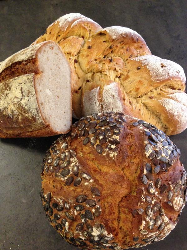 Ich hab dieses Jahr selbstgebackenes Brot dazu gesteuert. Roggenmischbrot, Zwiebel-Kartoffel-Speckzopf, Brot mit Maronen, gebackenem Kürbis und Kürbiskernen, sowie (nicht im Bild) Ciabatta.