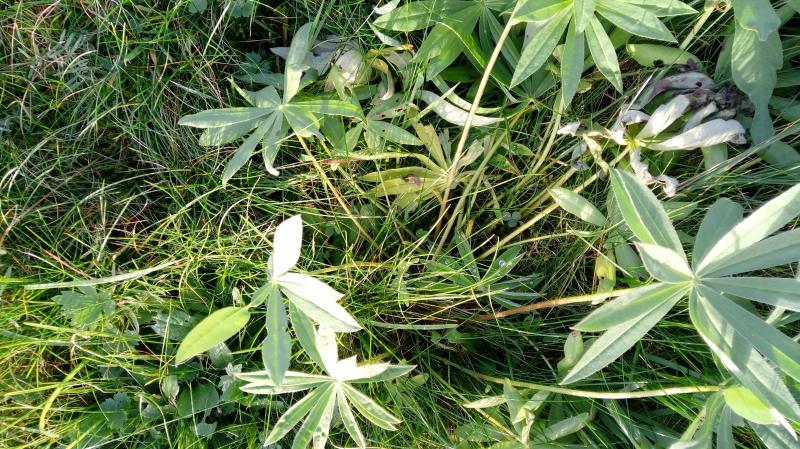 Lupinen wachsen in der Eifel auch in Wiesen der Straßenränder und Böschungen, die dann im Juli oder August gemäht werden - danach bilden viele einheimische Wiesenpflanzen einen Blattschopf, ich denke, das ist hier auch der Fall, für mich sieht das Laub ebenfalls sehr nach Lupine aus.